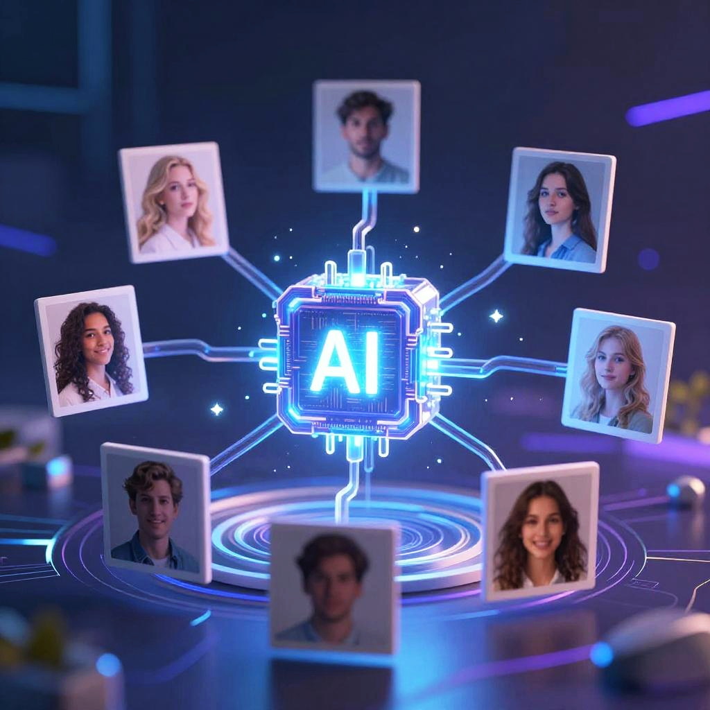 Free AI photo generator showcasing a blend of natural and artificial intelligence, a glowing AI core connected to floating photo outputs, ethereal blue and purple palette, tech-inspired abstract background, futuristic digital art style