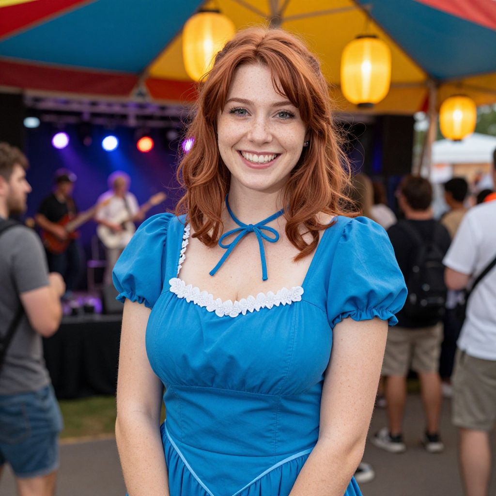 A cheerful woman in her late 20s with auburn hair, freckles, and a sunny smile dressed in an Anastasia Blue dress as a costume at a themed cosplay festival under a colorful festival canopy with lanterns and music playing in the background.. The woman has big tits and cute face