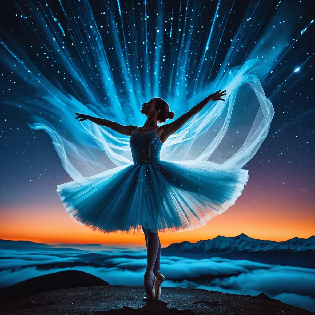 Silhouette of a ballerina striking a graceful pose on pointe, wearing a flowing, translucent blue dress. The background features a twilight sky with a bright orange horizon, star-filled sky, and aurora-like blue light streaks surrounding the dancer. Mountain peaks and a sea of clouds are visible below, creating a mystical and ethereal atmosphere.