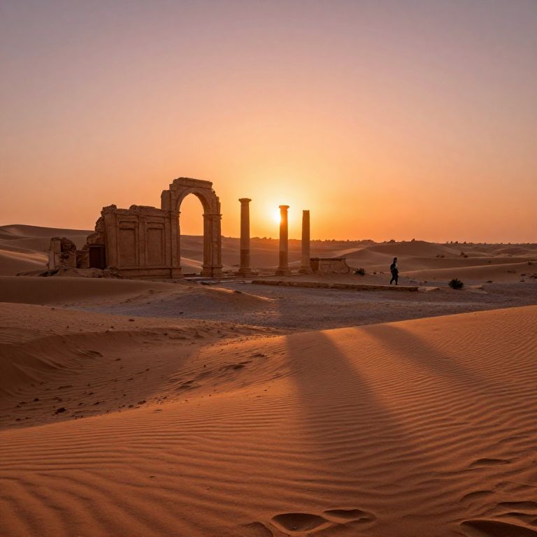 Photograph of a desert sunset featuring ancient, weathered stone arches and columns silhouetted against a vibrant orange and pink sky. The sun is low on the horizon, casting long shadows across rippled sand dunes in the foreground. A small figure stands near the ruins, adding scale. The background shows gently rolling sand hills. The image has rich, warm colors and a serene, timeless atmosphere, emphasizing the contrast between the ancient structures and the natural desert landscape.