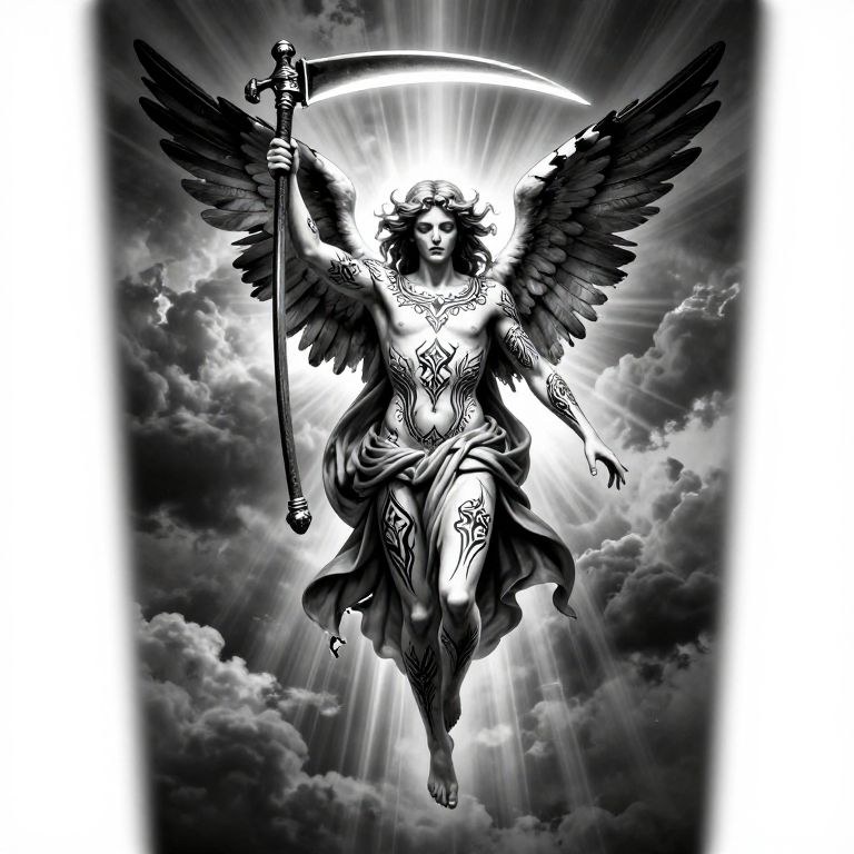 Black-and-white digital illustration of a winged, angelic figure with detailed, intricate tattoos, floating amidst dark, cloudy skies. The figure, with curly hair and a stern expression, holds a scythe in its right hand, raised above its head. The left hand is positioned at its side, and a flowing, draped cloth covers its lower body. Radiant light beams emanate from behind the figure, creating a halo effect. The image features high contrast and dramatic shading, emphasizing the figure's ethereal and powerful presence. The overall style is reminiscent of gothic or dark fantasy art.