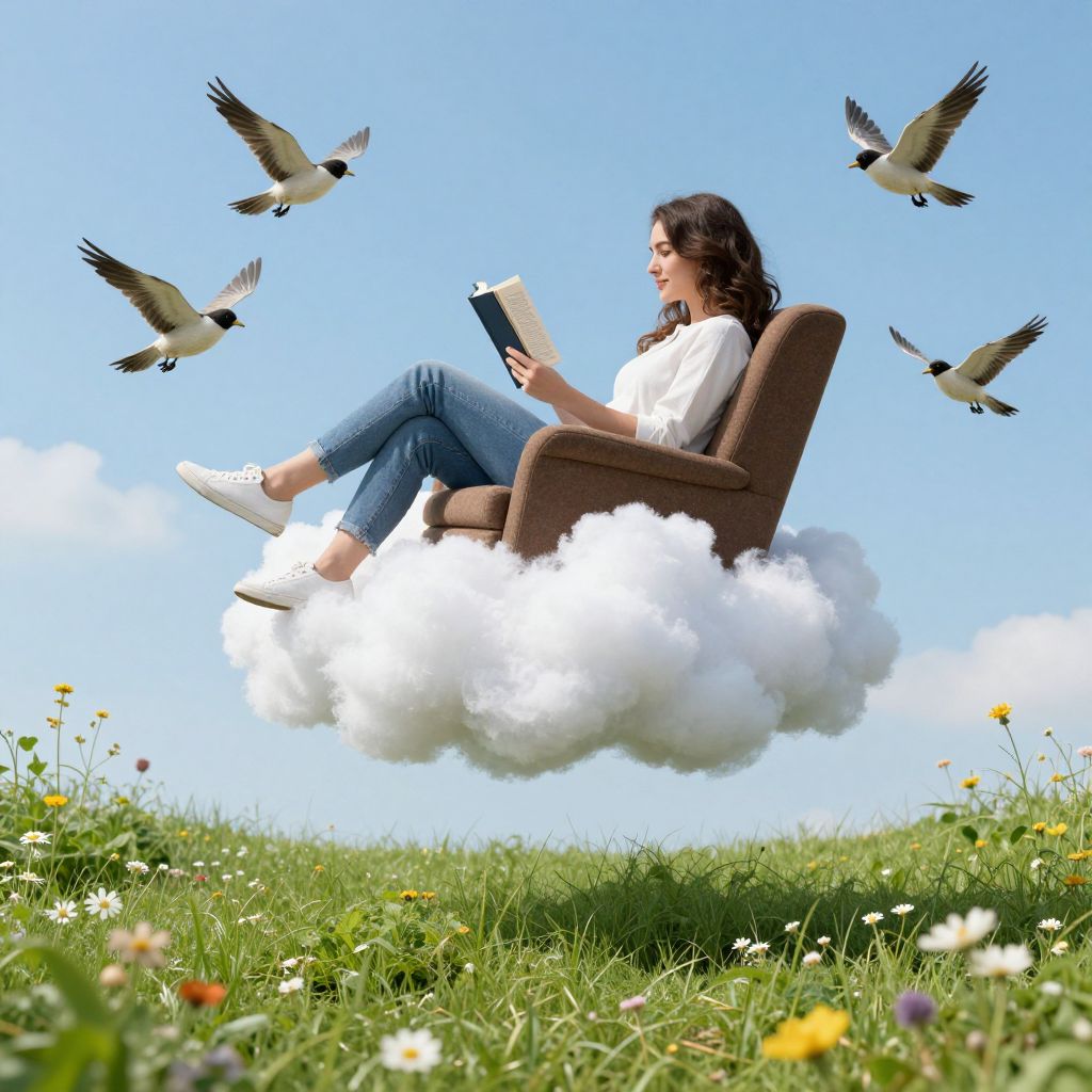Photograph of a woman with long brown hair, wearing a white blouse and blue jeans, sitting on a brown armchair, floating on a white cloud against a bright blue sky. She reads a book, with six white and black birds flying around her. The foreground shows a green grassy field with small yellow and white wildflowers. The image has a surreal, dreamy quality. The woman's white sneakers are visible, and she looks focused on her book.