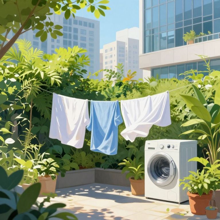 This digital illustration depicts a sunlit urban balcony with lush green plants in the foreground and background. A white washing machine with a front-loading design is positioned on the right side. Hanging from a clothesline in the center are two white shirts and one light blue shirt. The balcony is surrounded by tall glass buildings reflecting the bright blue sky. Potted plants, including ferns and large leafed varieties, are scattered around, adding to the greenery. The sunlight casts soft shadows, creating a warm and inviting atmosphere. The overall style is vibrant and realistic, emphasizing the contrast between urban and natural elements.