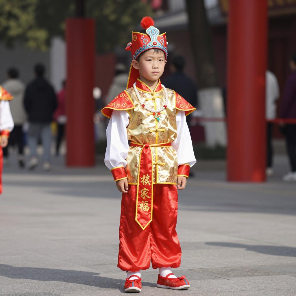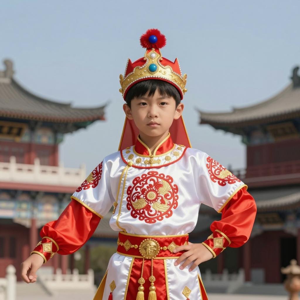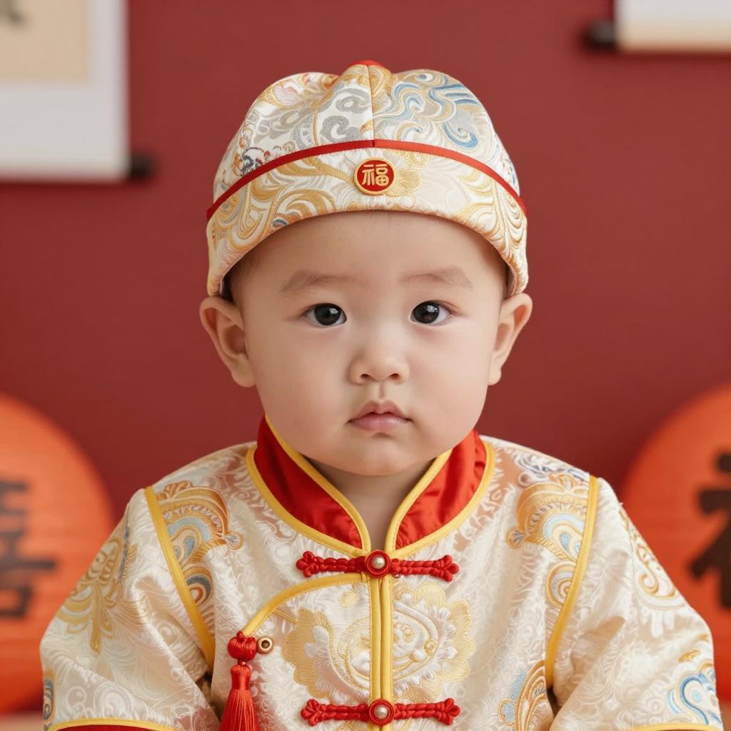 Infant hei hei costume, photograph of cute Asian baby, wearing traditional white and gold ornate robes, red accents, and matching hat with golden emblem, focused on baby's face, slightly blurry background, indoor setting, warm colors, soft lighting, front-facing, serious expression, traditional Asian clothing, cultural attire, high detail, realistic ure, elegant and formal, symmetrical composition, centered subject, soft-focus background, traditional costume, decorative embroidery, child's innocence