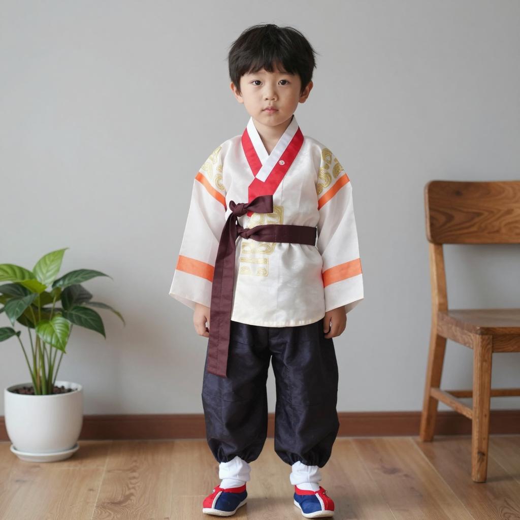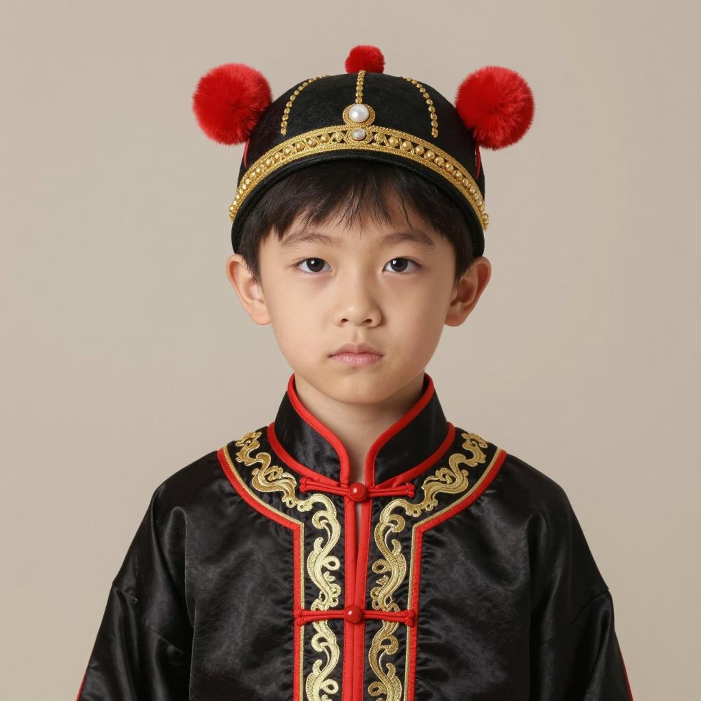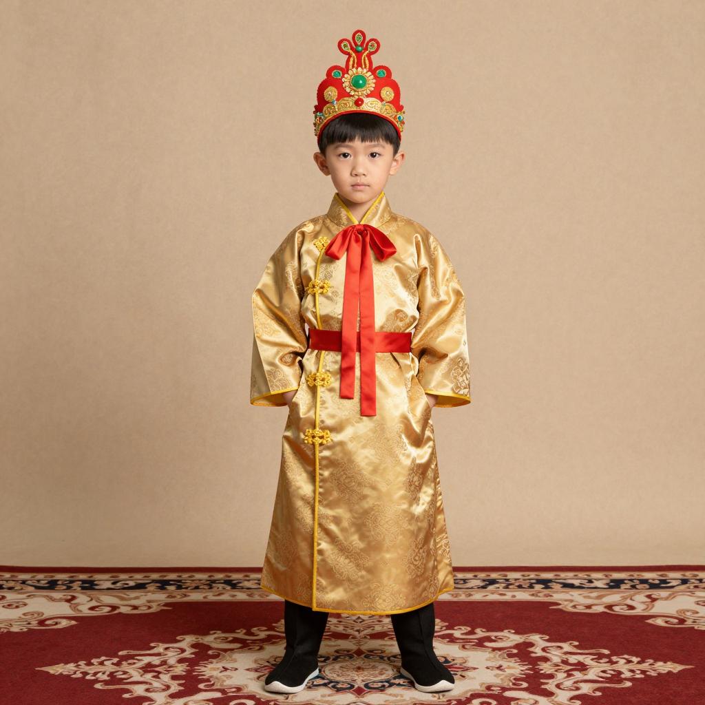 Infant hei hei costume, photograph of cute Asian baby, wearing traditional white and gold ornate robes, red accents, and matching hat with golden emblem, focused on baby's face, slightly blurry background, indoor setting, warm colors, soft lighting, front-facing, serious expression, traditional Asian clothing, cultural attire, high detail, realistic ure, elegant and formal, symmetrical composition, centered subject, soft-focus background, traditional costume, decorative embroidery, child's innocence