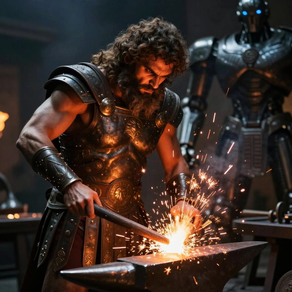 Photograph of a muscular, bearded man with curly brown hair, wearing black, metallic, shoulder armor and matching gauntlets, intensely forging metal at an anvil. Bright orange and yellow sparks fly from the glowing hot metal in the center of the anvil. In the dimly lit background, a towering, armored robot stands, partially blurred. The scene is set in a dark, industrial workshop, with faint, warm lights and hazy smoke creating a dramatic atmosphere. The man's focused expression and the dynamic sparkles emphasize the intensity of his craft.