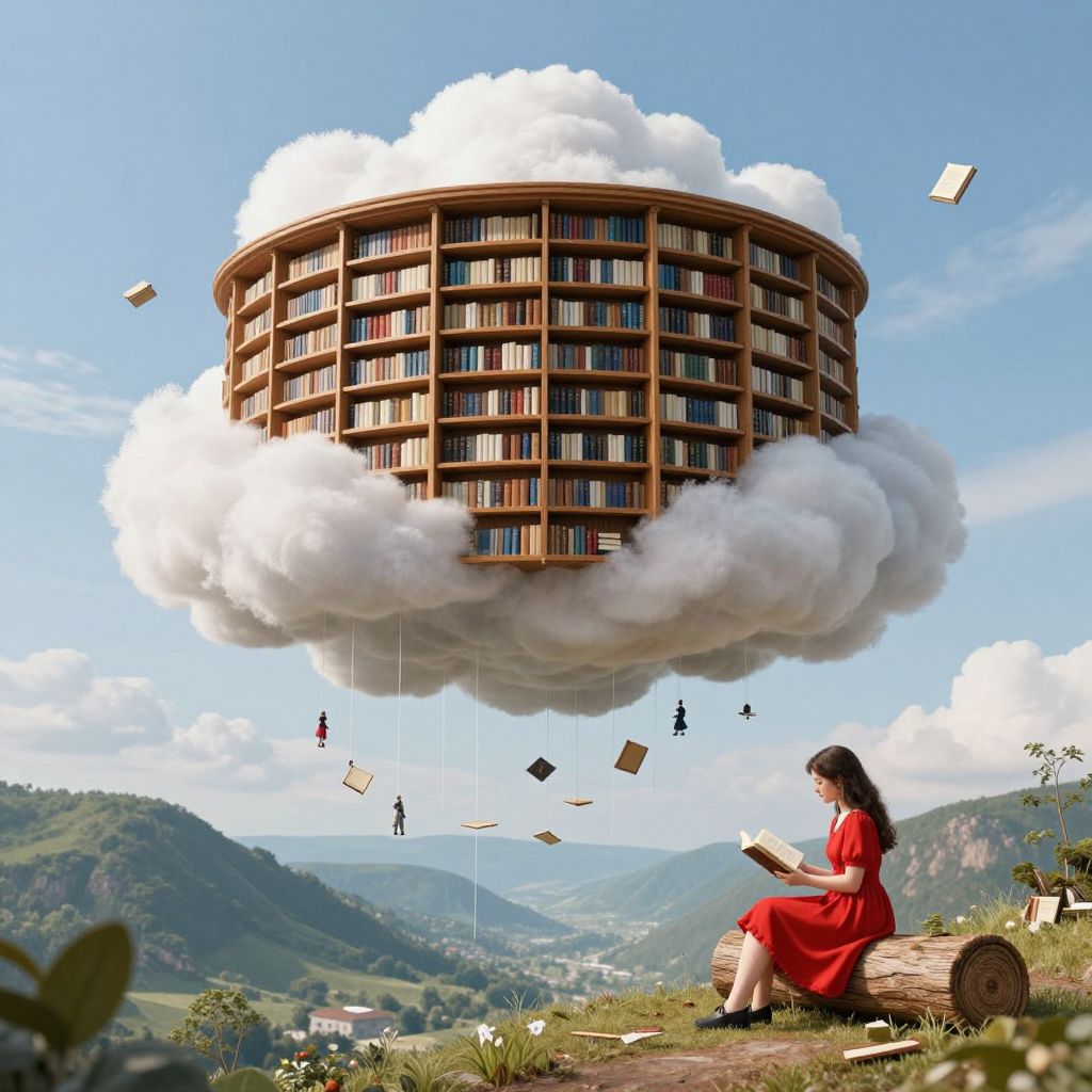 In this digitally created artwork, a woman with long dark hair, wearing a red dress, sits on a log in a grassy, mountainous landscape, reading a book. Above her, a large, cylindrical cloud-shaped library floats in the clear blue sky. The library, filled with numerous books, is surrounded by fluffy white clouds. Small, floating silhouettes of people and books surround the cloud library. The background features rolling green hills and a distant valley with scattered buildings. The overall style combines surrealism with a whimsical, imaginative feel.