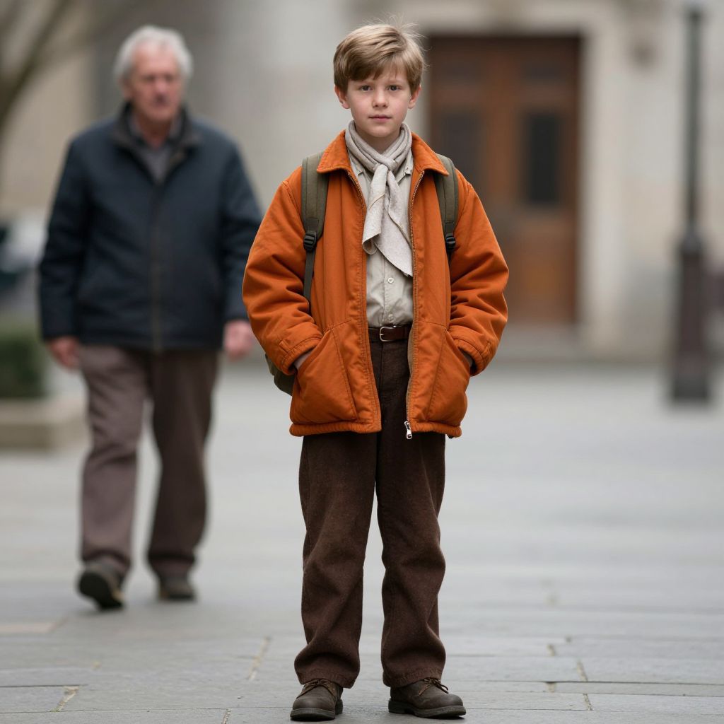 Photograph of a young boy standing in a city street, centered in the frame. He has light brown hair and is wearing an orange jacket, white shirt, beige scarf, brown pants, and black shoes. He has a green backpack and his hands in his jacket pockets. An older man with gray hair, wearing a dark jacket and brown pants, walks in the blurred background. The street is paved with gray stones, and there's a blurred wooden door and beige building in the background. The boy's expression is serious, and the overall mood is somber.