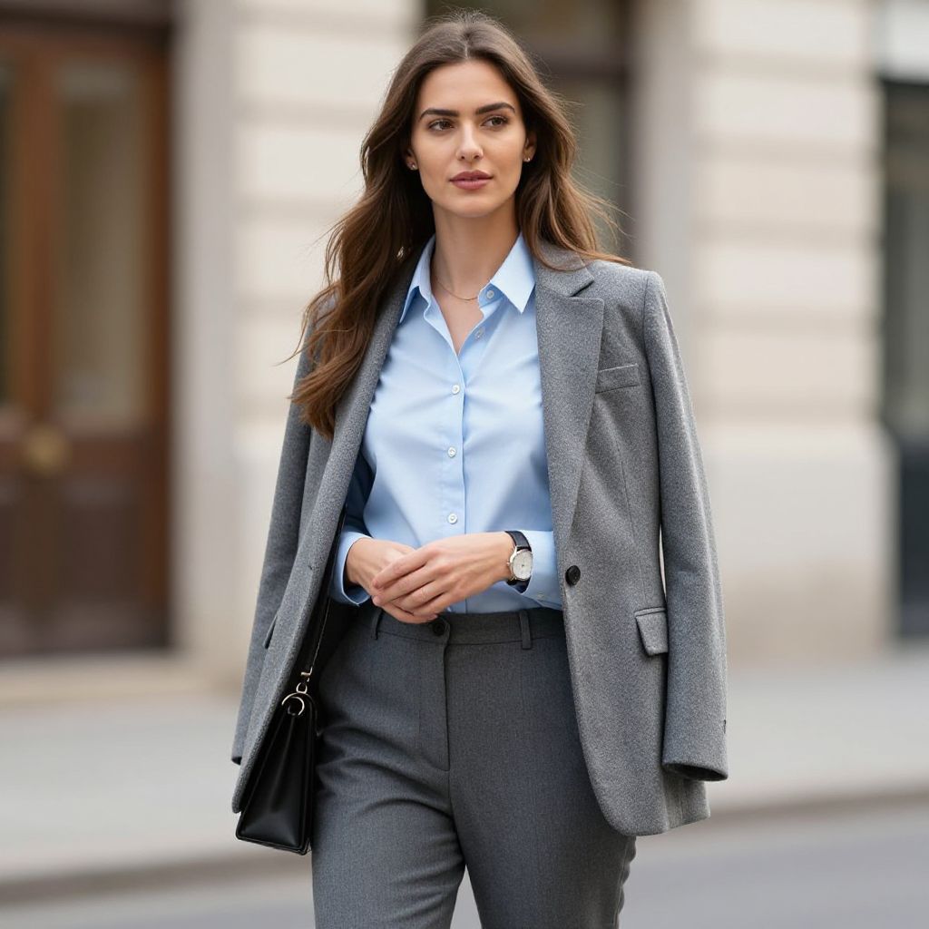 Photograph of a confident, brunette woman in a black suit, white shirt, and black heels, holding a black handbag, standing on a bustling