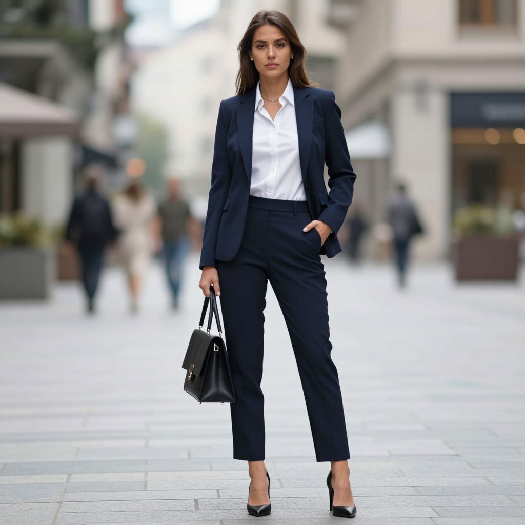 Photograph of a confident woman standing on a city sidewalk. She has long brown hair, light skin, and is wearing a fitted black blazer, white button-up shirt, and black high-waisted trousers. She holds a black leather handbag in her right hand and has her left hand in her pocket. She wears black high-heeled shoes. The background is slightly blurred, showing a busy street with people and buildings, including a shop with a brown awning on the left. The image has a professional, fashion-forward style.