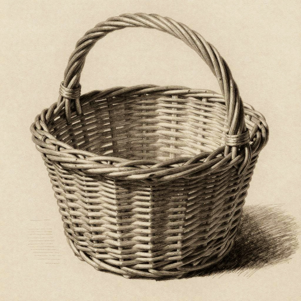 Basket texture drawing, vintage rustic wicker basket with fine crosshatch lines, emphasis on texture and depth, sepia tones, pencil sketch on aged paper
