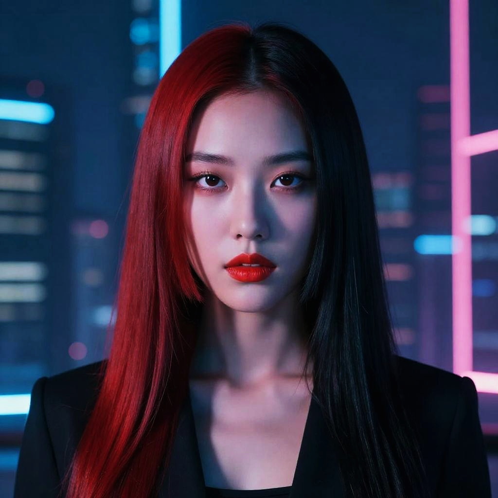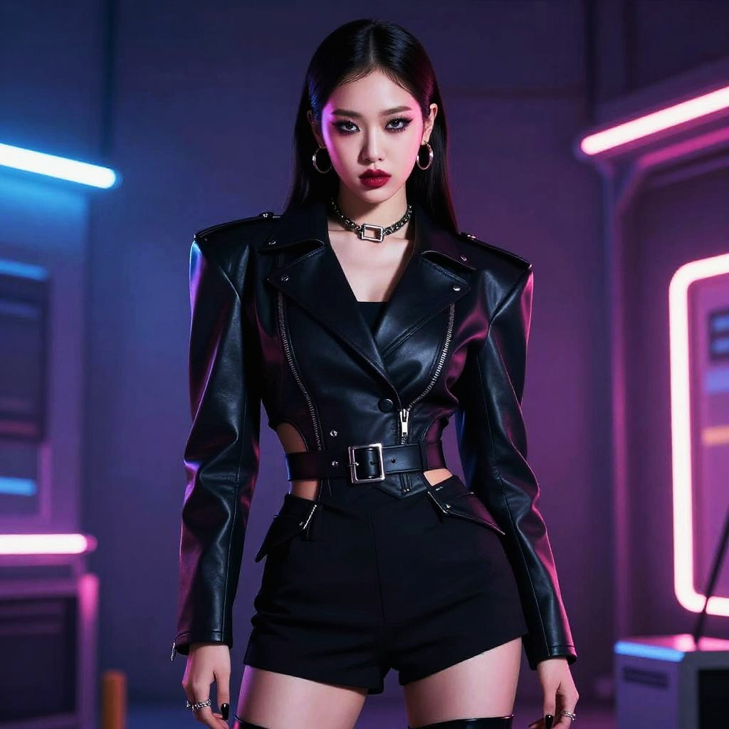 Korean female model in avant-garde high fashion outfit, dramatic makeup and accessories, futuristic background with neon lights, bold colors, sharp contrasts, editorial style