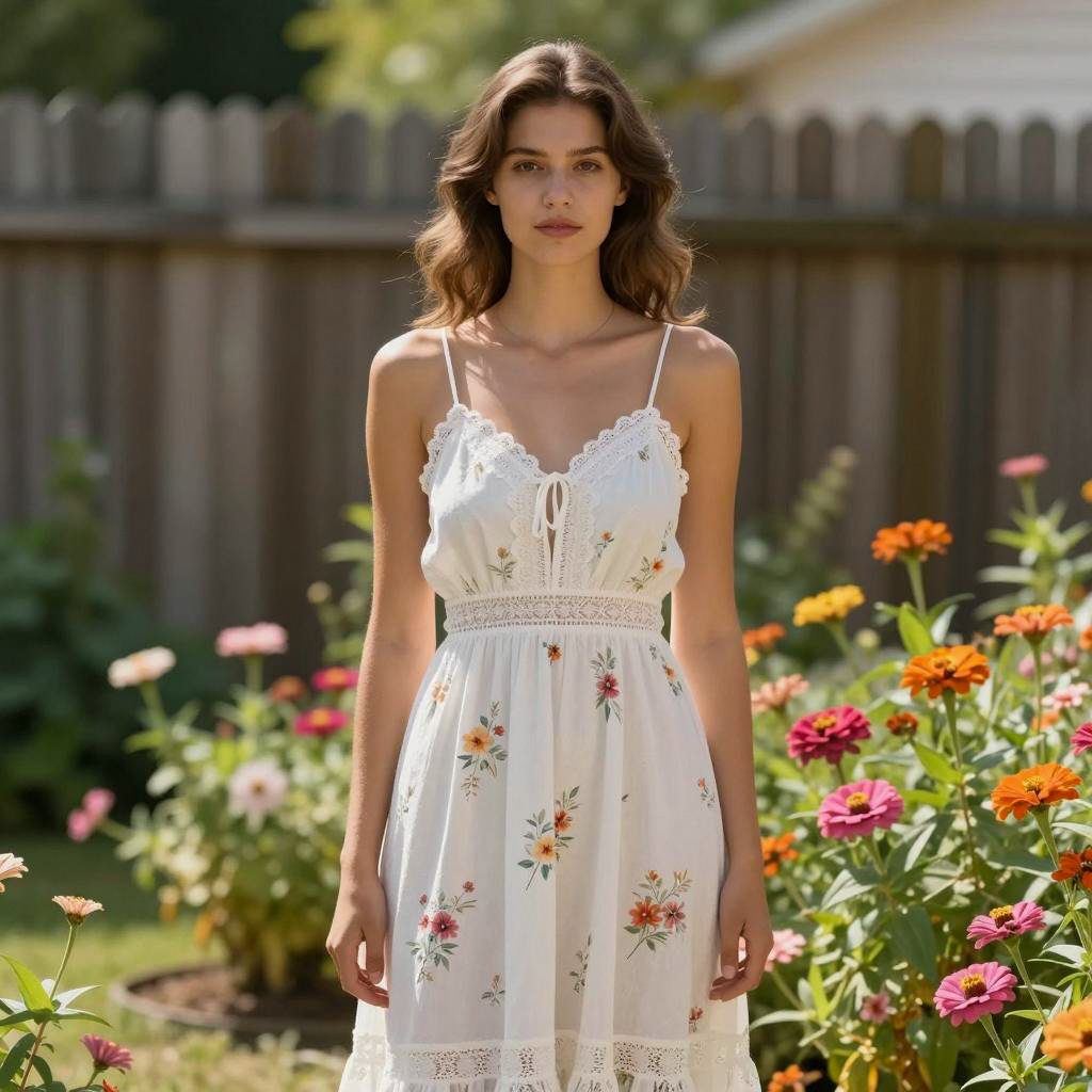 Retirement party dress, photorealistic, young woman, standing in colorful garden, bright daylight, wearing white sleeveless dress with floral embroidery, blonde wavy hair, blue eyes, light makeup, gentle smile, hand on waist, tall and slender, background full of pink, red, yellow roses, green leaves, sunlit, soft shadows, summer vibes, clear sky, elegant and feminine, spring/summer fashion, detailed ures, natural light, portrait orientation