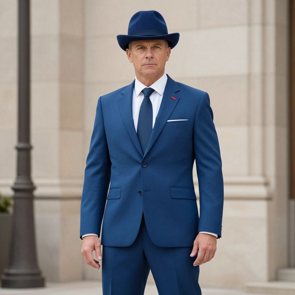 Photograph of a middle-aged Caucasian man with a fair complexion, wearing a dark blue suit, white dress shirt, and dark blue tie. He also sports a matching dark blue fedora hat. His expression is serious and he stands with a straight posture. A small red flower is pinned to his left lapel. The background features a light beige stone building with vertical lines and a black streetlamp on the left. The lighting is natural, indicating an outdoor setting. The man's hair is short and neatly combed.