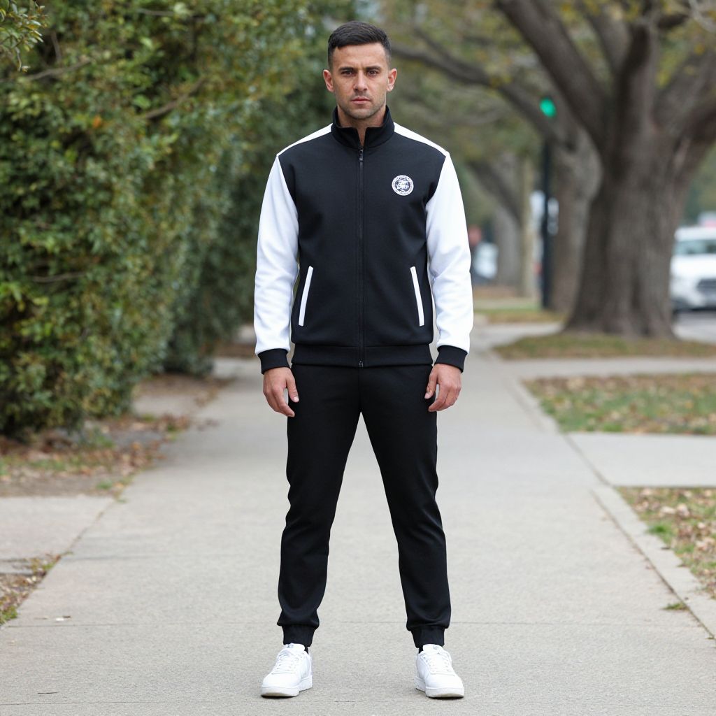 Sportswear Brand Costume, man in a black and white jacket standing on a sidewalk