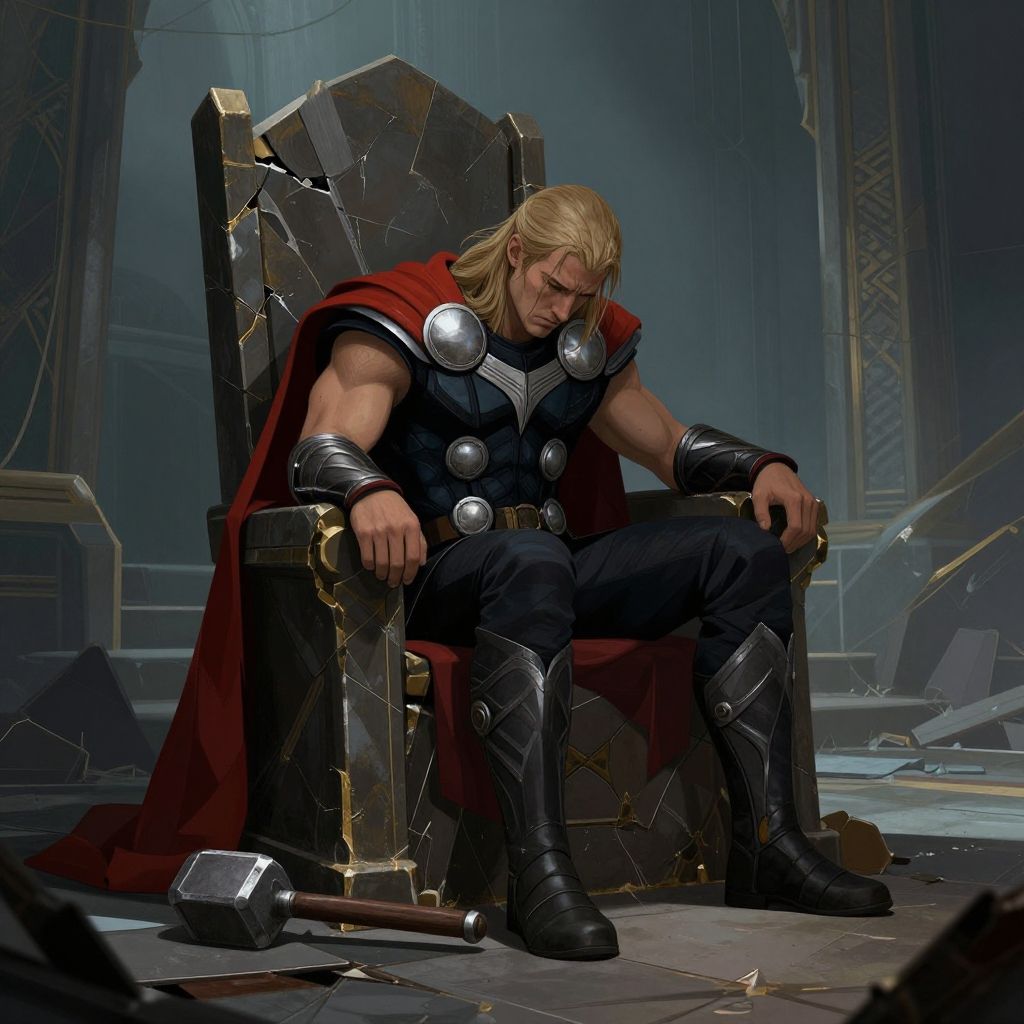 Depressed Thor costume illustration showing a weary hero seated on a fractured throne, head bowed, hammer resting on the ground, set in a shadowy, abandoned Asgardian hall with worn textures and cold tones highlighting his despair.
