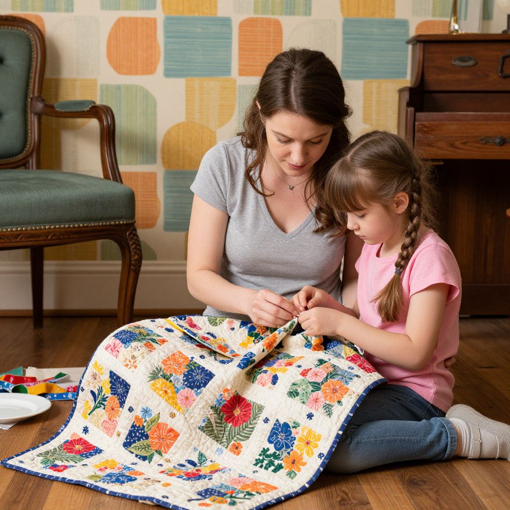 Woman and child engaged in crafting a floral-patterned quilt together, seated on a wooden floor with vintage furniture and a colorful wallpaper backdrop.