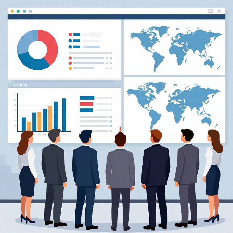 Hatbox a wall of dashboards containing pie charts, graphs, and a world map. A group of business people in suits are standing in a group pointing at the dashboard. Pixel art,