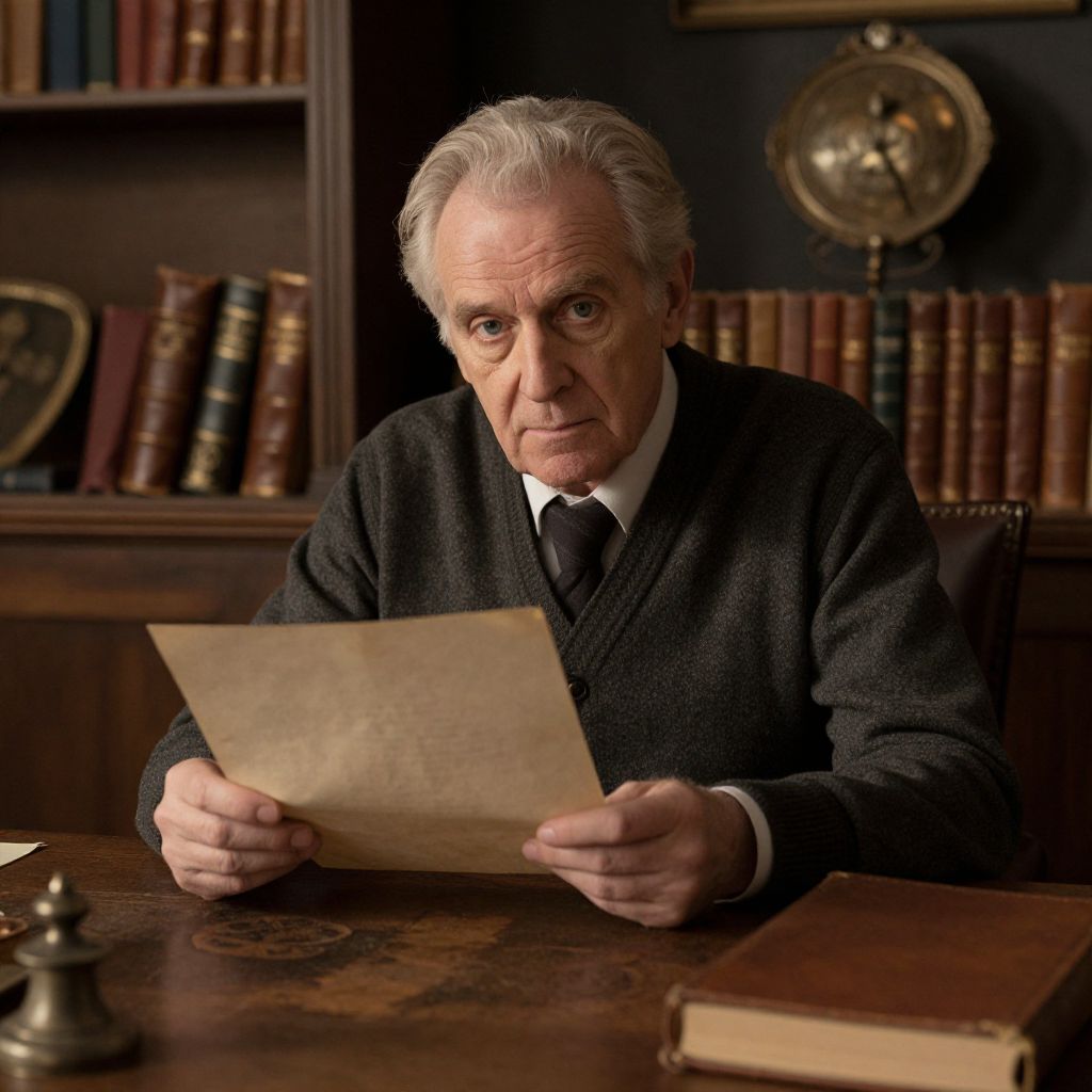 Photograph of an elderly white man with gray hair and wrinkles, wearing a dark, textured sweater over a white shirt and black tie, sitting at a wooden desk in a dimly lit study. He holds a yellowed, creased paper in both hands, looking intently at it. The background features wooden bookshelves filled with old, leather-bound books and a round, ornate globe. A brass desk clock and another book are on the desk. The man's expression is serious and focused. The lighting casts soft shadows, enhancing the vintage, scholarly atmosphere.