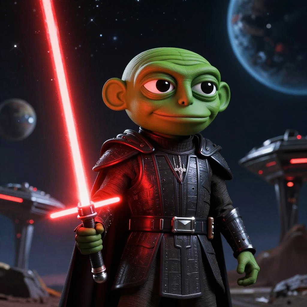 Pepe Star Wars mashup, Pepe the Frog dressed as a Jedi with a glowing green lightsaber on a starry galactic battlefield, cinematic sci-fi style, vibrant colors
