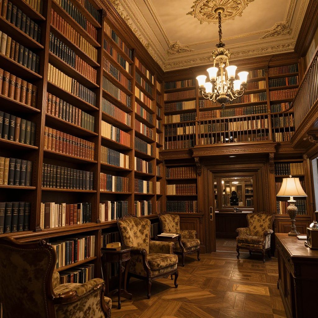 Cozy, dimly-lit library with ornate ceiling, wooden bookshelves filled with colorful books, vintage armchairs, and a ch
