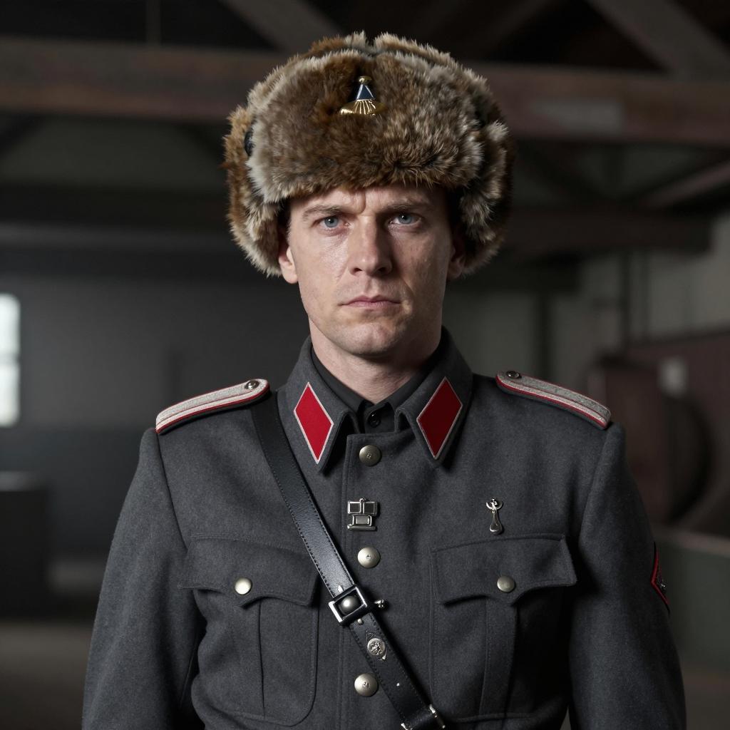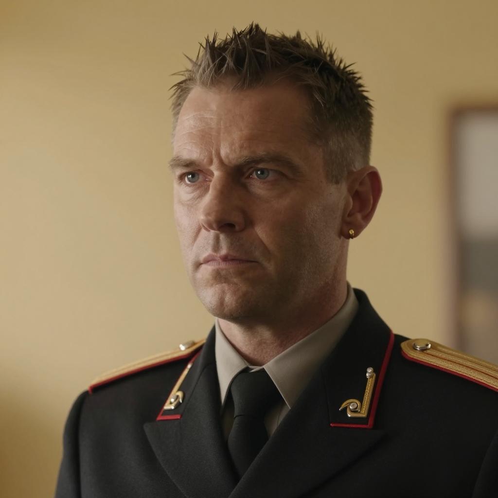 Photograph of a middle-aged man with short, spiked brown hair, wearing a dark military uniform with red and gold epaulettes, gold earring in his left ear, gray shirt, black tie. Background has a warm yellow glow, ured wall. Man's expression is serious, slightly intense.