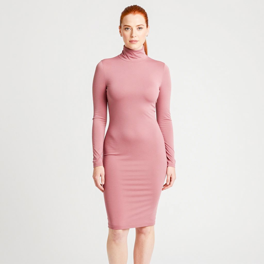 Daphne scooby doo costume, photograph of a woman with red hair in a ponytail, wearing a tight, long-sleeve, rose pink turtleneck dress, standing against a plain white background, looking at the camera with a neutral expression, light makeup, simple gold earrings, studio lighting, realistic, full body shot, woman with fair skin, medium build, casual pose, minimal background distractions, contemporary fashion style