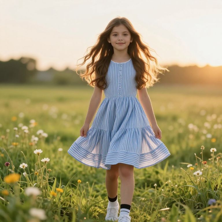 A beautiful young girl with long, flowing brown hair and warm, expressive eyes stands on a gentle dirt hill, wearing a vibrant yellow dress that flutters slightly in the breeze. She wears a straw hat tilted to one side, adding a charming, whimsical touch, and a delicate silver necklace with a small blue stone hangs gently around her neck. The scene is set against a clear blue sky filled with soft, fluffy clouds, with golden sunlight filtering through, casting a warm glow over the landscape. The dirt hill is slightly sloped, surrounded by wildflowers and a few scattered trees, creating a peaceful and idyllic atmosphere.