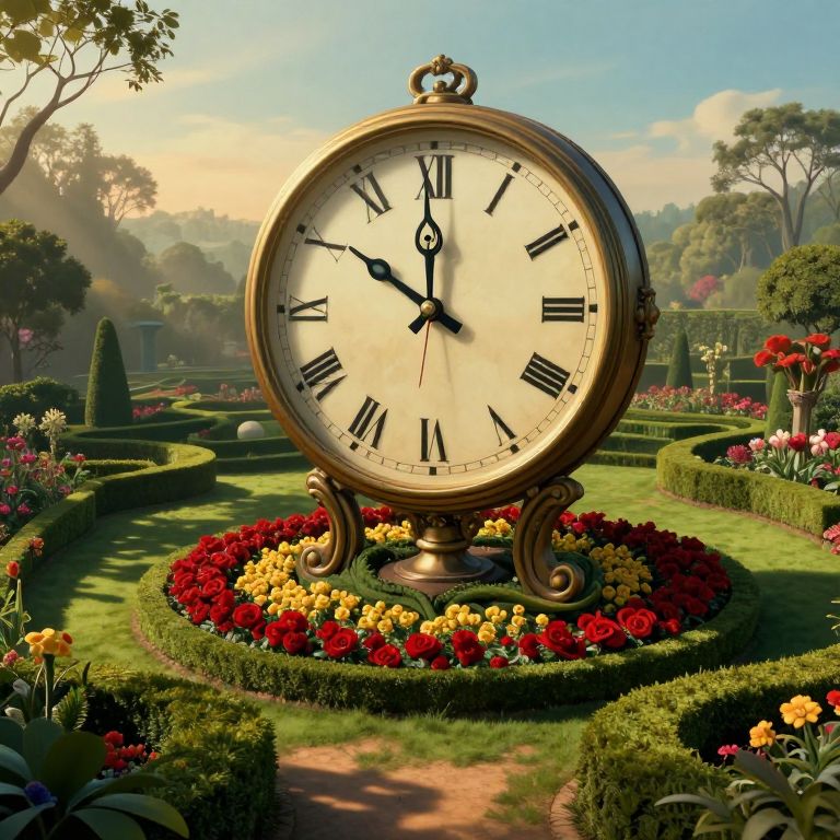 Photograph of an ornate, gold-colored, round clock with black Roman numerals and black hands, standing on a pedestal surrounded by a circular bed of vibrant red, yellow, and white flowers. The clock is set in a meticulously manicured garden with lush green lawns, topiary bushes, and colorful flower beds. Sunlight filters through trees in the background, casting a warm, golden glow over the scene. The garden features winding paths and a clear blue sky, creating a serene and elegant atmosphere. The overall style is realistic with a slight romantic, idealized quality.