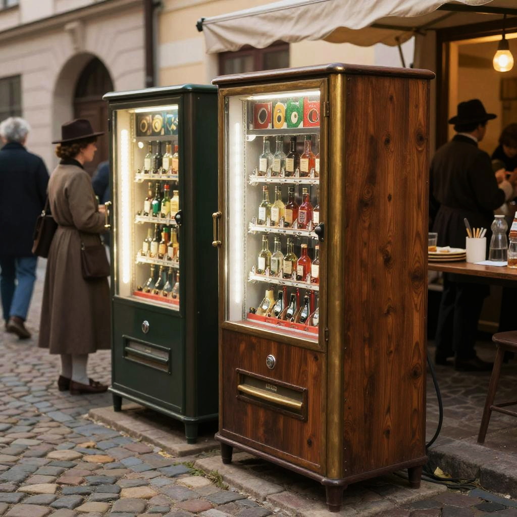 Automaten set in an old European street market, vintage mechanical vending machines with brass and wood details, cobblestone street, warm ambient lighting, people dressed in early 20th century attire, nostalgic and atmospheric scene