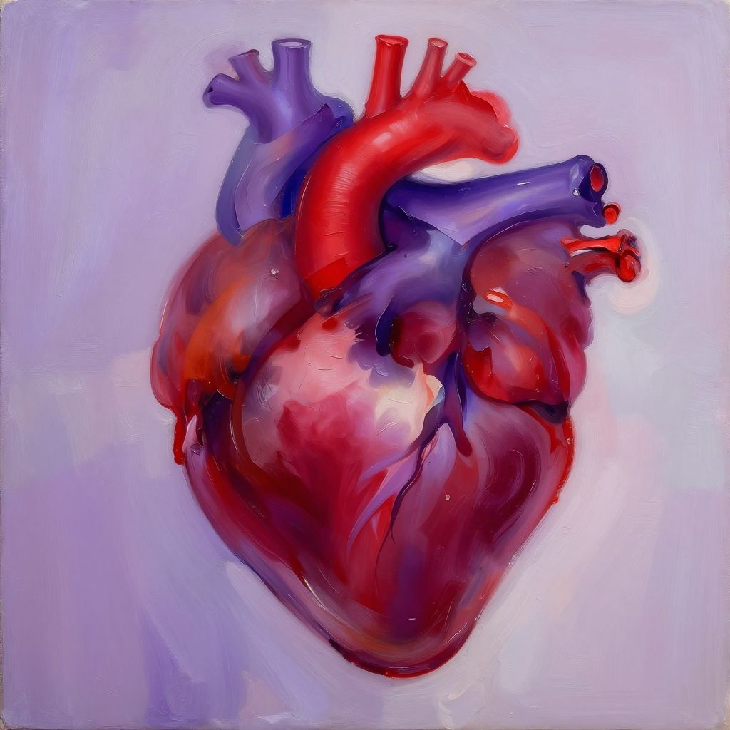 Abstract digital painting of a human heart, vibrant reds, purples, and blues, with bold, expressive brushstrokes on a white background.