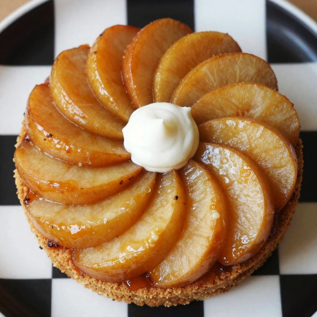 Close-up photo of a beautifully arranged dessert. The centerpiece is a spiral pattern of caramelized apple slices, glistening with a glossy brown finish. They fan out from a small white dollop at the center. The apple slices rest on a golden-brown, slightly crumbly base. The background has a black and white geometric pattern, adding contrast. The overall look is both appetizing and visually striking.