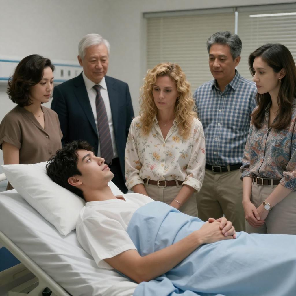 A pale, shirtless young man with short brown hair lies in a metal-framed bed covered by blue sheets, eyes closed in a bedroom with wooden walls. Nearby stands an older man wearing a blue suit, black tie, and a dark hat with a serious expression and hands on his hips. In the background, a younger Asian man in an orange plaid shirt and jeans watches with arms crossed. The room contains minimal furniture and a wall-mounted fan.