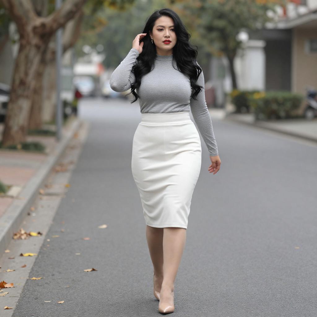 Photograph of a curvy woman with long, wavy black hair, wearing a gray long-sleeve top and a white, high-waisted, knee-length skirt. She has fair skin, red lipstick, and is walking on a paved street with autumn leaves scattered. She wears beige high heels and touches her hair with her right hand. The background shows blurred trees and buildings.