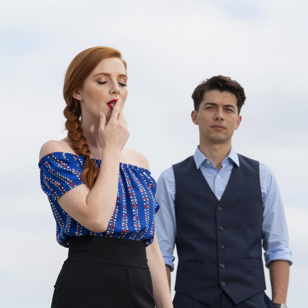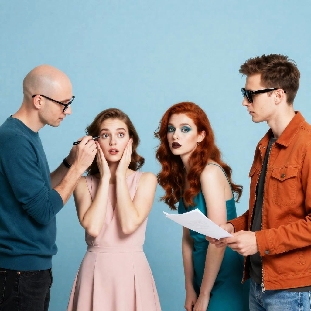 Photograph of four people in a studio. Bald man in teal shirt, glasses, focused on makeup. Woman with pink dress, hands on face, wide-eyed. Red-haired woman in teal, dramatic makeup, leaning forward. Man in orange jacket, black sunglasses, holding papers. Light blue background.