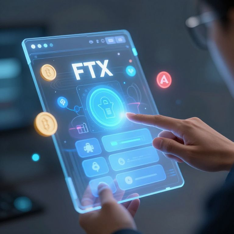 FTX-themed digital wallet interface concept displayed on a transparent holographic device, user interacting with virtual buttons, vibrant blockchain symbols floating around, futuristic technology environment, emphasis on security and innovation