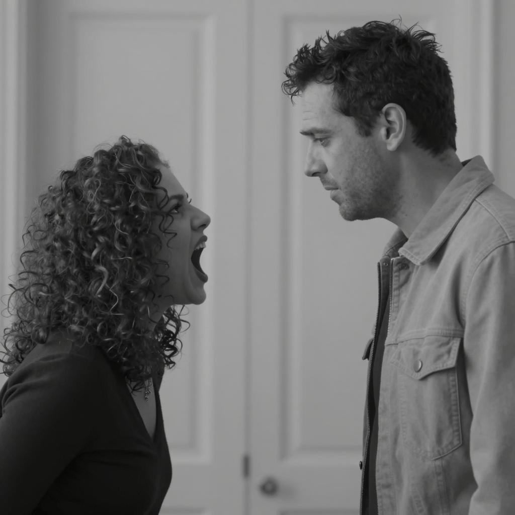 Middle-aged bald man with plaid jacket and red shirt, duct tape over mouth, looking up. Woman with curly brown hair, earrings, black jacket, leans close to his face. Man in background, black clothing, surprised expression. Warm, dim lighting.