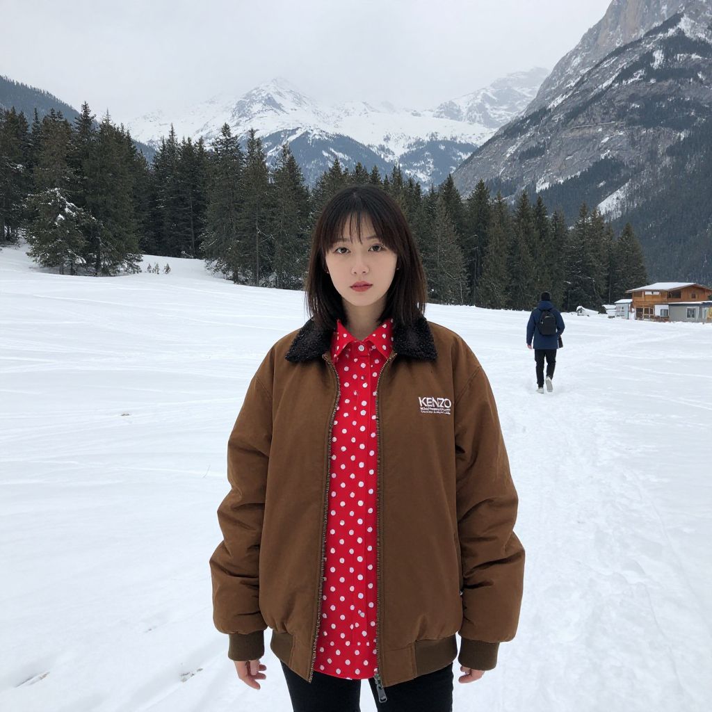 Woman wearing a brown Kenzo jacket layered over a red polka-dot shirt stands in a snowy landscape with mountains and evergreen trees in the background, while another person walks away in the distance.