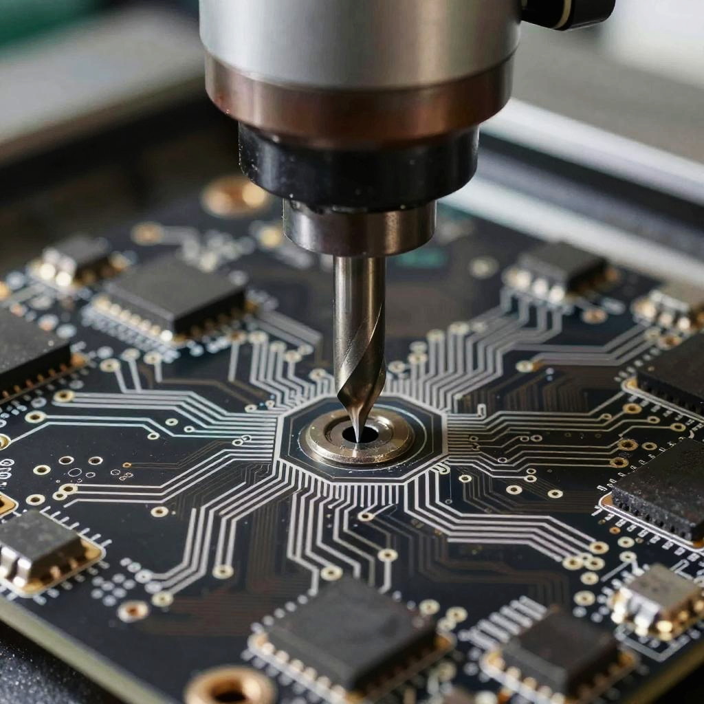 Close-up photo of a CNC milling machine's drill bit in mid-action, cutting into a black printed circuit board with white circuit diagrams. The drill bit is metallic with a worn, brownish top and is centered in the image, surrounded by the detailed circuit board. The background is slightly blurred, focusing attention on the drill and board. The overall lighting is bright, highlighting the intricate details.