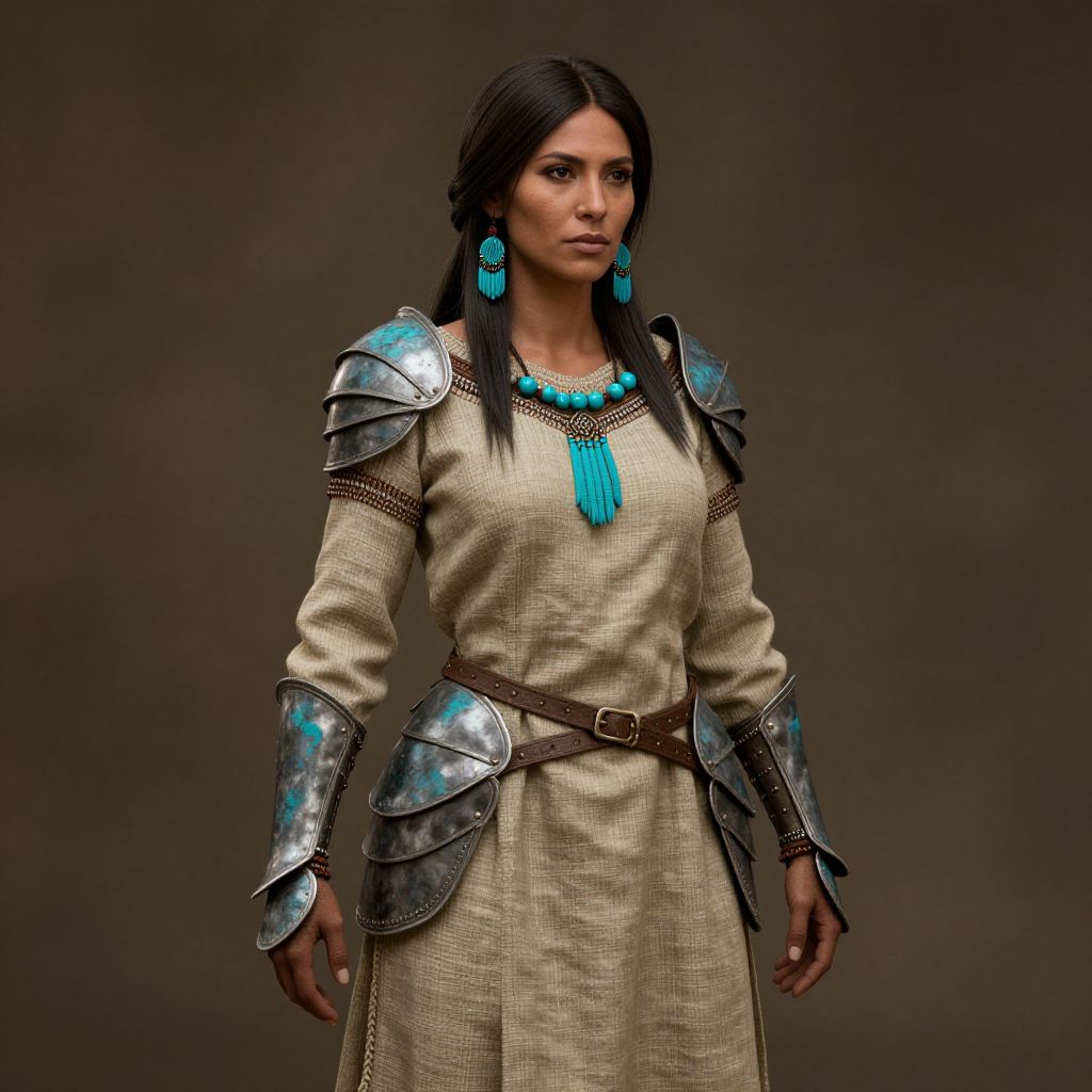 Photograph of a dark-haired woman with a medium brown complexion standing against a dark brown, gradient background. She wears a beige, long-sleeved dress with a brown belt and silver, metallic shoulder and arm armor. Her armor has a shiny, reflective texture. She has long, straight black hair and wears large, turquoise, circular earrings and a matching turquoise necklace. Her expression is serious and focused. The lighting highlights her armor and jewelry, creating a dramatic effect. The overall style is reminiscent of fantasy or historical warrior attire.