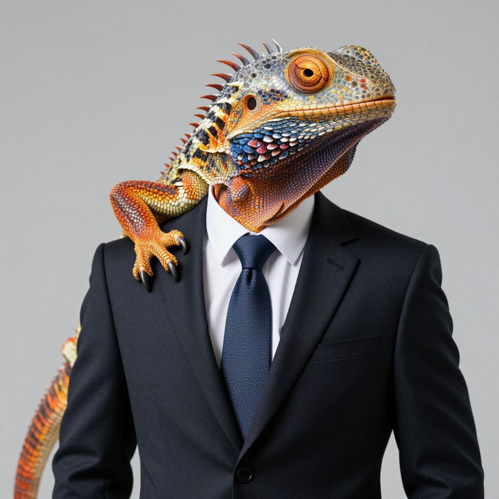 Photograph of a colorful, detailed iguana with orange, blue, and white scales, wearing a black suit, white shirt, and navy tie
