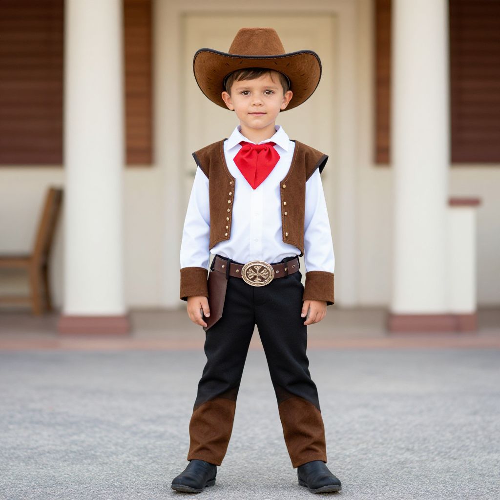 "Zorro Costume Kid, boy in a cowboy outfit and hat standing in front of a building"