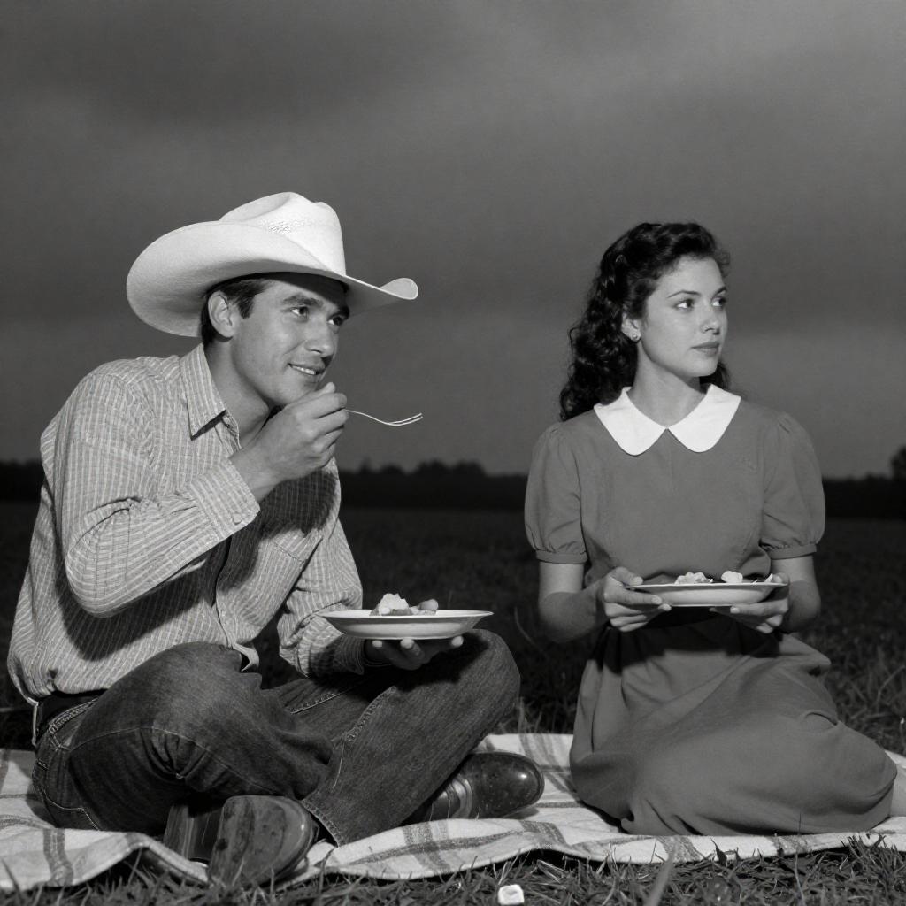 Black-and-white photograph of a young woman with a bob haircut in a white blouse, standing beside a man in a striped shirt and large hat, pointing excitedly to the right. The man's arm extends forward, and they are seated in a wooden carriage with a striped canopy. The woman looks slightly to the left, while the man's expression is animated.