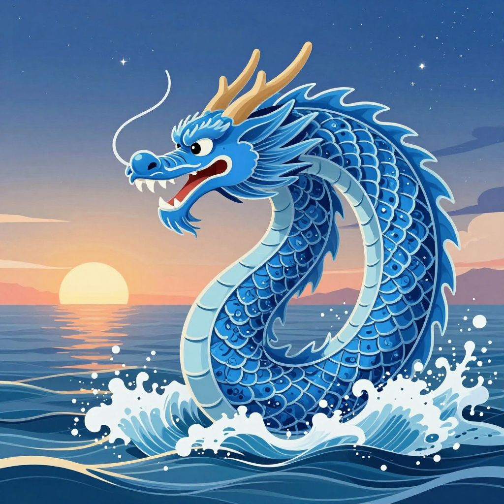Digital illustration of a large ocean wave artistically shaped like a blue sea dragon or serpent. The wave is curling with water splashes and detailed swirling patterns, set against a calm sea and a sun setting on the horizon under a starry sky.
