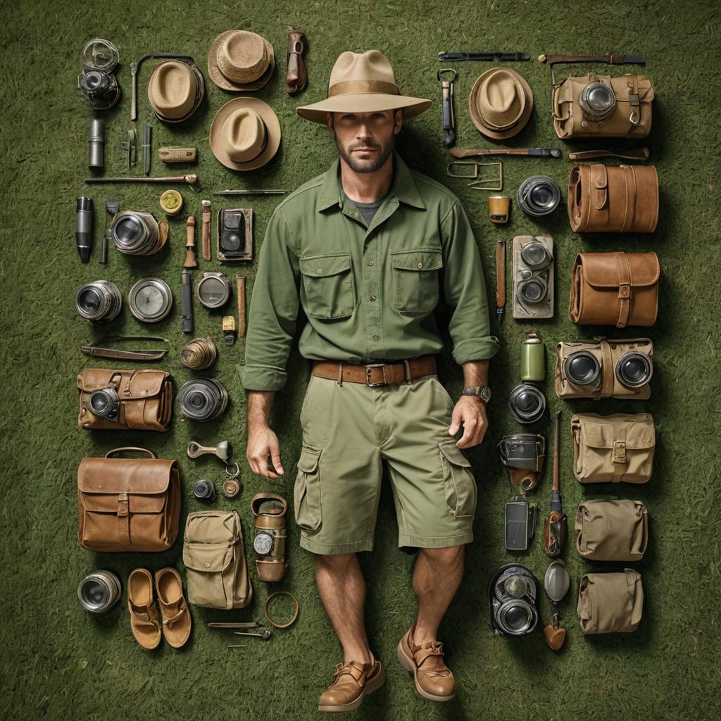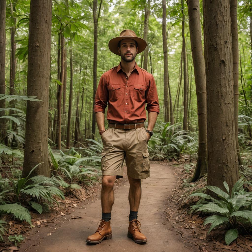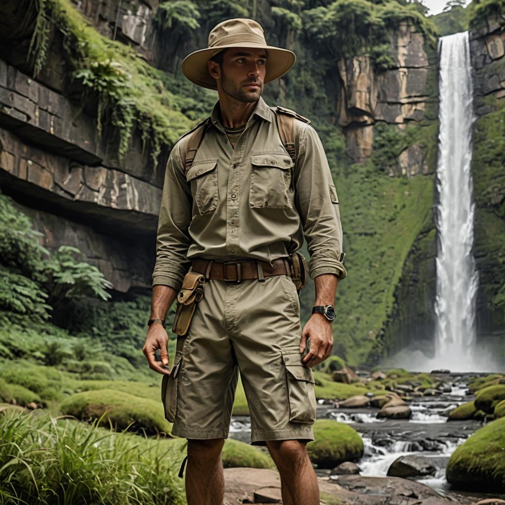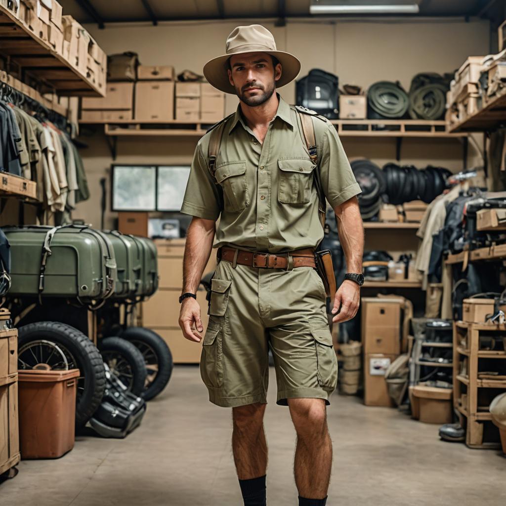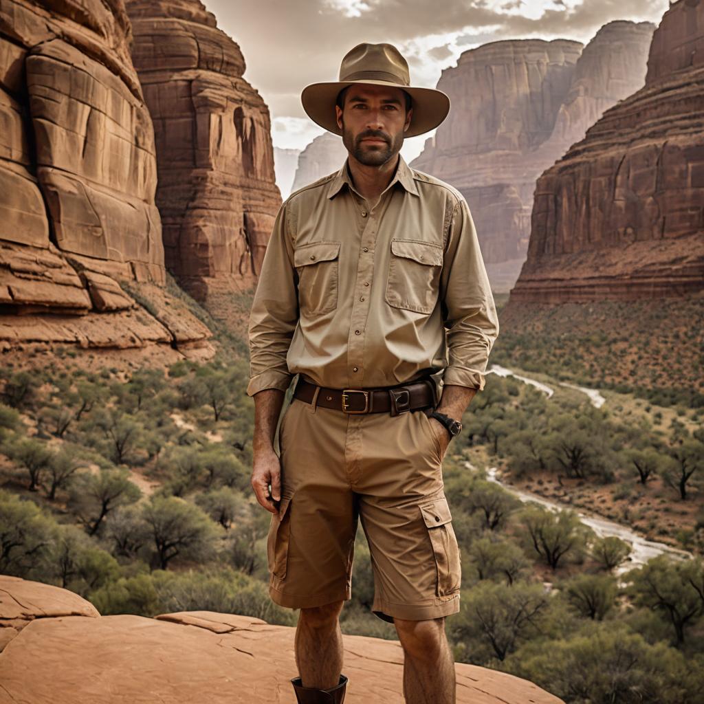 Photo of a Stocky man, Side Part, safari outfit, khaki long-sleeve shirt in Copper, cargo shorts in Polyester, wide-brim hat, leather boots, utility belt, adventure-ready, by a canyon, dramatic light