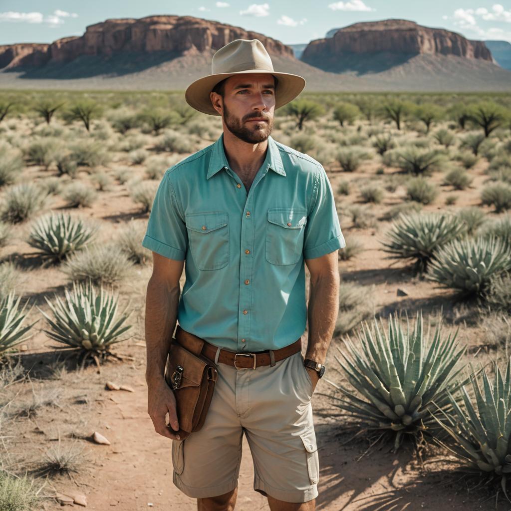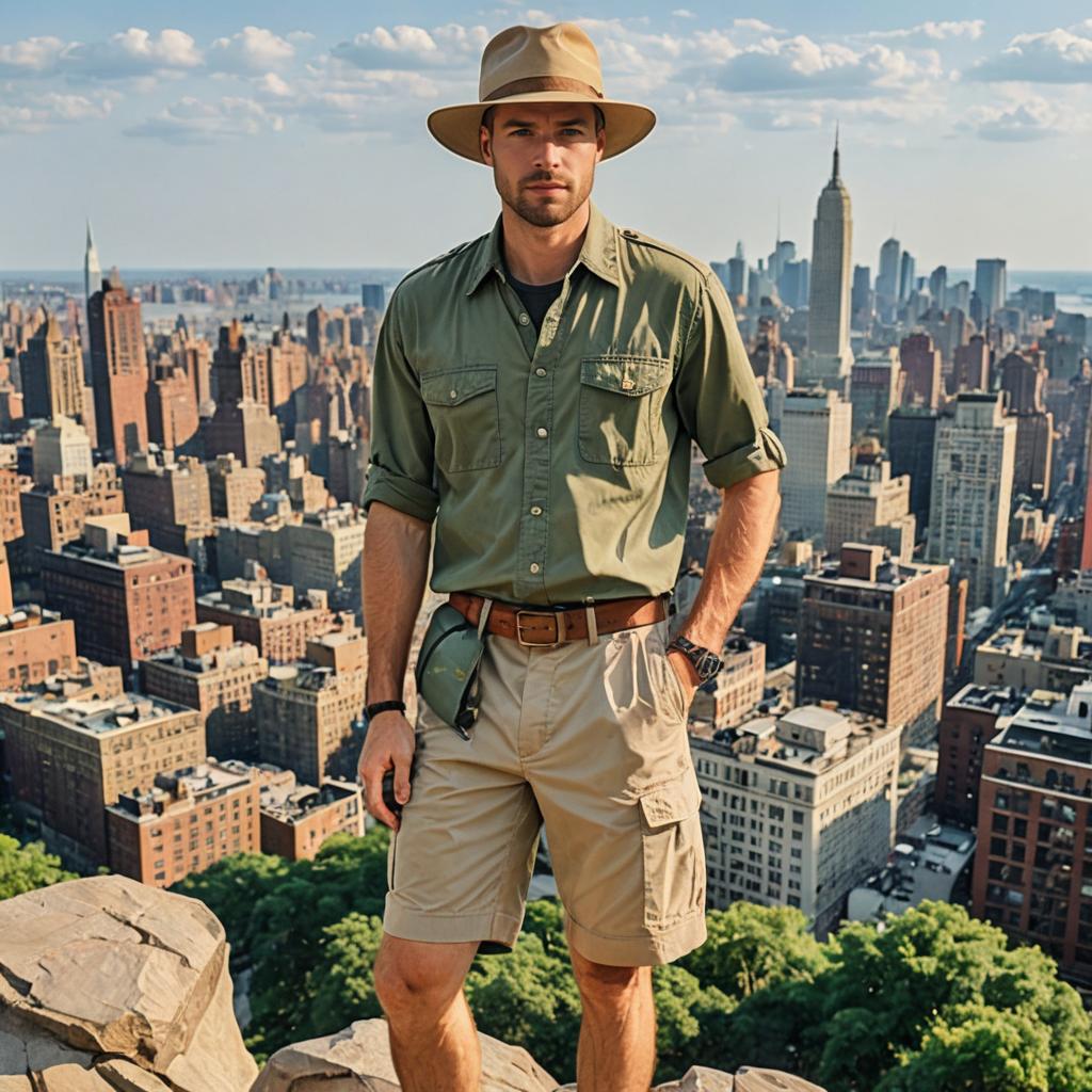 Stocky man with side-parted dark hair wearing a copper khaki long-sleeve shirt, polyester cargo shorts, wide-brimmed hat, leather boots, and utility belt standing in front of a large canyon with dramatic lighting and natural desert landscape.