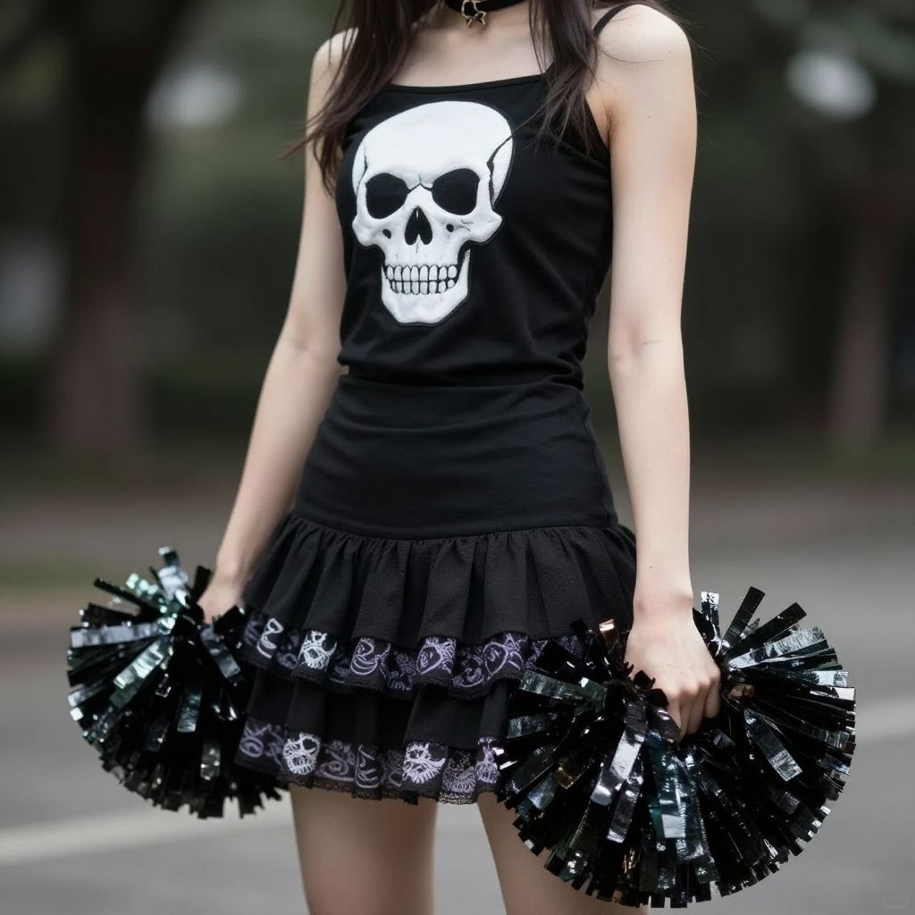Merger_marupe_sash, ((gothic cheerleader:1.1) outside wearing a black (skull top:1.2) with a skull on it and a (frilly skirt:1.2) holding (pom poms:1.2), gothic, (cheerleader:1.2):1.2), bokeh, f1.4, 40mm, photorealistic, raw, 8k, textured skin, skin pores, epiCRealism