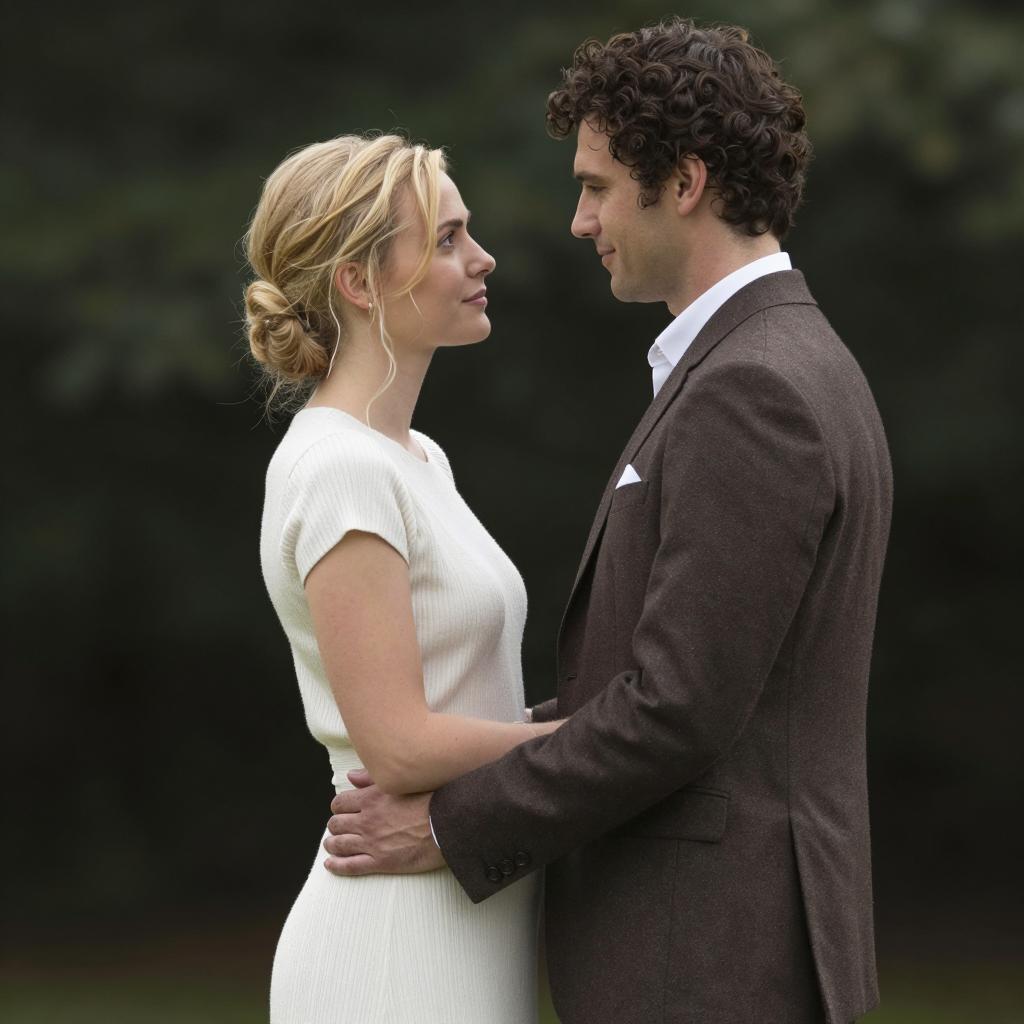 A man and woman standing close together. Woman on the left, blonde hair in a side part, wearing a black sweater, smiling slightly. Man on the right, light brown curly hair, wearing a gray suit, white shirt, black tie, looking at the woman with a slight smile. Both have fair skin. Background: white curtains. Man's head slightly tilted towards the woman. Woman's head turned slightly towards the man.