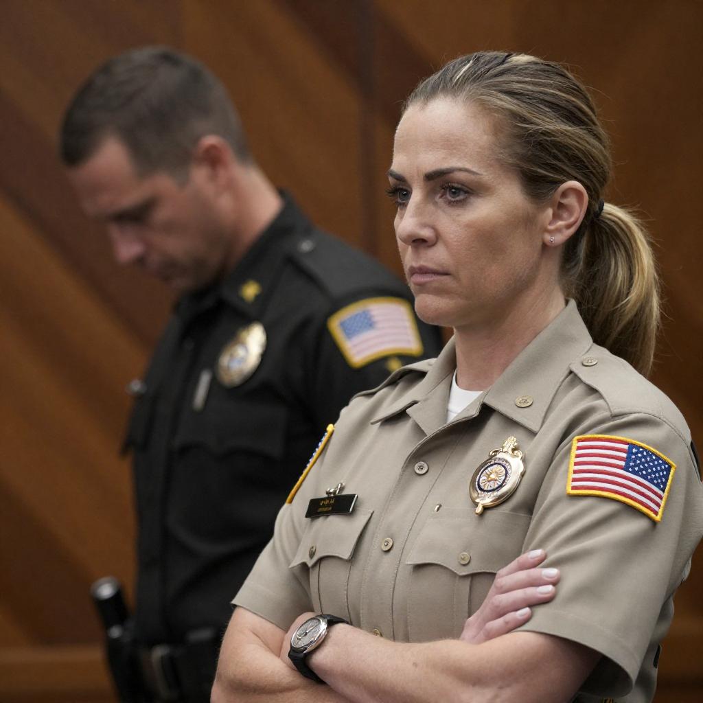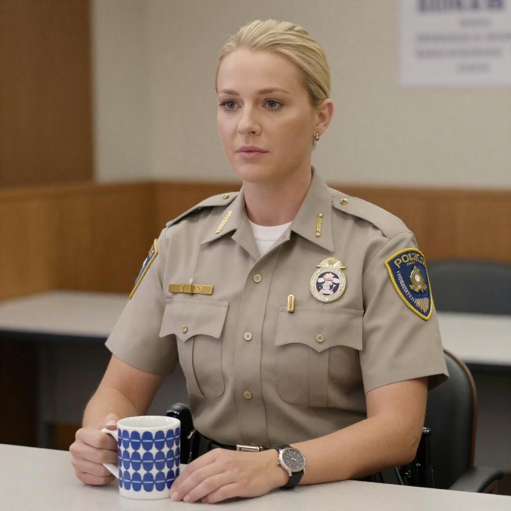 Photograph of a blonde female police officer with light skin, wearing a beige uniform with badges, holding a blue and white patterned mug, leaning on a desk. Background includes wooden partitions and a sign. She has a neutral expression.
