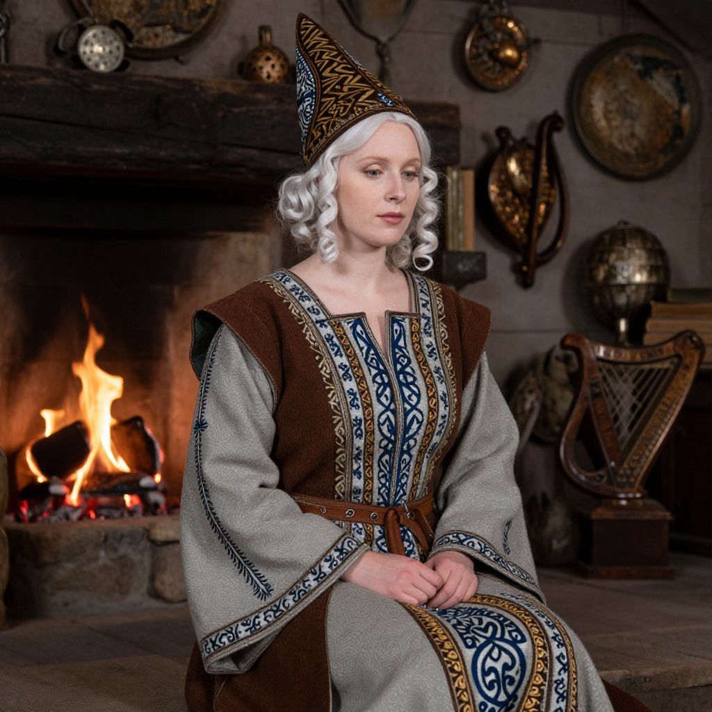 Photographic scene of a medieval Irish woman in a handcrafted costume with traditional Irish motifs, such as harp patterns and tribal designs, wearing a layered tunic and a pointed hat; she has smooth, pale skin, fair curls, and a serene expression, sitting by a fire in a wooden cottage surrounded by ancient Irish artifacts and books. The woman has big tits and cute face